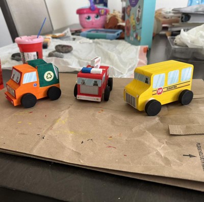 - Features 3 wooden vehicles: one school bus, one fire truck and one garbage truck