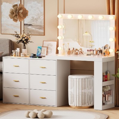 PAKASEPT Farmhouse Vanity Desk with Mirror and Lights, 59” H Makeup Vanity with 3 Lighting Modes& Charging Station, 5 Drawers, 4 Cabinets