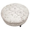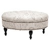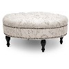 With sumptuous button tufting and black turned wood legs, the Palfrey Upholstered Ottoman instantly augments the elegance of your interior. This stunning modern ottoman is made in China with durable eucalyptus wood for its frame, firm foam cushioning, and beige linen upholstery with a fanciful French script print. Antiqued brass upholstery tacks line the sides. The Palfrey Round Ottoman requires minor assembly and should be spot cleaned as needed. This style is also available in solid colors: either dark gray or beige (each sold separately). 35"W x 35"D x 16.25"H
