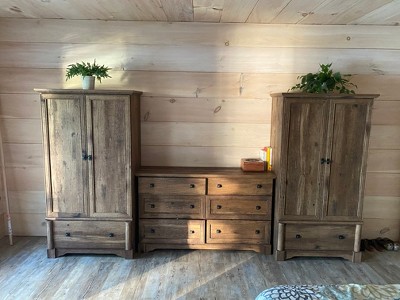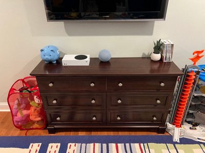 I purchased this dresser to sit between 2 armoires from the same collection. When I received it one drawer front was slightly damaged. I called customer service for assistance and they were great. They shipped a replacement that day and I received it a couple days later. I put this dresser together myself in about 2.5 hours (49 y/o female). The color is as shown on the website. The dresser is very sturdy and holds a decent amount of clothing. The drawers are easily adjustable, hang straight and glide in and out smoothly (a couple of the drawers were not fully closed when this pic was taken but they really do close nicely and evenly!) . It's a great piece for the price.