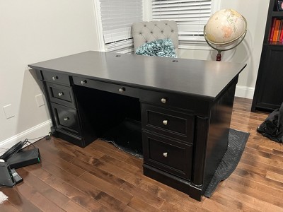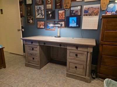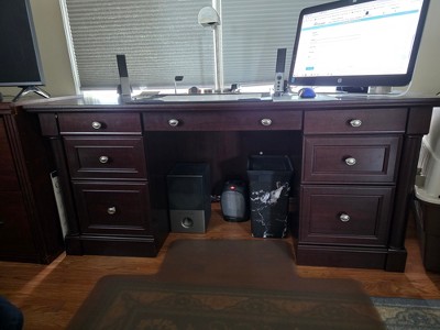 So happy to have purchased this desk directly from Sauder. It is beautiful and I love it. 7 drawers including 2 file folder drawers. Plenty of storage space. The quality is outstanding. However, the shipping carton was a bit damaged and had holes and lots of retaping on the end and corner. After opening the box, the desktop was slightly scarred and was missing a drawer side. Sauder customer service was outstanding and got me the missing part in a couple days and gave me a credit for the desktop which I was pleased with. Overall I am giving Sauder product a 5 star, customer service 5 star and quality of the desk a 5 star rating.