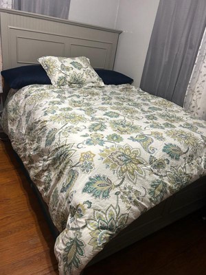 The Grey Palladium Comforter Set by Levtex Home is subltle sophisticated. Offered in green, yellow, grey, blue and white, this design will immediately transform your bedroom. Made with a soft, luxurious cotton, this comforter set features a Intricate paisley. It has a green, yellow, grey, blue and white on the front and a teal and white geometric pattern on the reverse. It is filled with a hypoallergenic 100% polyester filler. The Grey Palladium Comforter Set is machine washable and includes the comforter and pillow sham. Enjoy this for years to come!