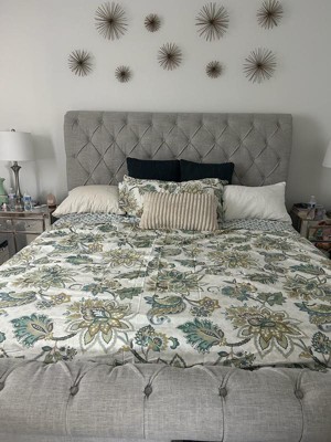 The Grey Palladium Duvet Cover Set by Levtex Home is subltle sophisticated. Offered in green, yellow, grey, blue and white, this design will immediately transform your bedroom. Made with a soft and luxurious cotton, this duvet cover set features a Intricate paisley. It has a spring showers on the front and a teal and white geometric pattern on the reverse. It closes with easy to use, durable buttons. The Grey Palladium Duvet Cover Set is machine washable and includes the duvet and pillow sham. Enjoy this for years to come!