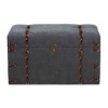 Easily declutter and organize any space with the eye-catching Palma storage ottoman. Made in China, the Palma is fully upholstered in smooth gray fabric and equipped with a cushioned lift-top seat that reveals ample storage space for a variety of items. Showcasing a vintage aesthetic, the Palma is accented with brown faux leather straps and antique brass metal latches for added style and security. Fully assembled, the trunk is decorated with brass studs for a touch of glamour. Ideal for areas with limited space, the Palma storage ottoman is an excellent upgrade to any home.
