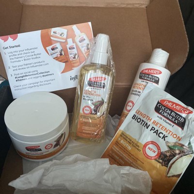 Palmer’s Cocoa Butter Formula Length Retention system with Biotin, fully strengthens hair with powerhouse natural protectants that help block fragileness, brittleness, breakage and split ends, to help hair achieve its optimal length. Silicone free, intense revitalizing treatment, restores elasticity and shine, while sealing in moisture.