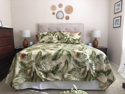 Whether you live at the seaside or further inland, Tommy Bahama Palmiers bedding collection offers the ultimate in island elegance for your bedroom oasis. Layering bold prints, vivid colors, and beautiful fabrics creates a unique decorative environment that is both restful and visually dynamic. Dramatic tropical foliage is printed on soft cotton sateen in deep greens and neutral tones on ivory with a coral accent note echoed by the casual awning stripe on the European shams and accent pillow. Coordinate with one of our stone washed cotton sheet sets and enjoy a comfortable and relaxing sleep. Machine washable for easy care.