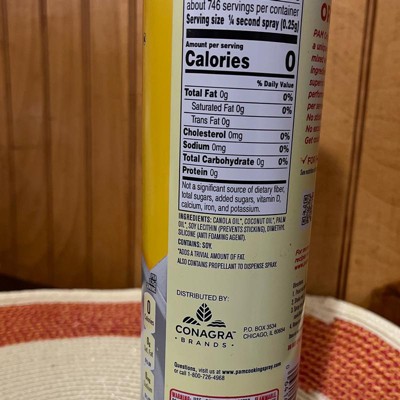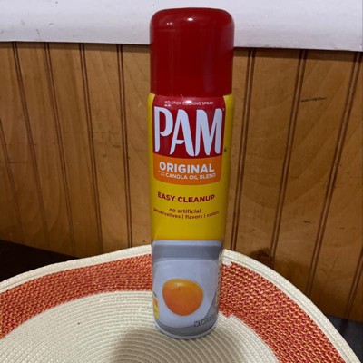 Cleaning your cookware is quick and easy with PAM Original Canola Oil Blend No-Stick Cooking Spray. Formulated for superior no-stick performance, this non-stick cooking spray is made with a canola oil blend and will help you effortlessly pull off your next meal. Spend more time eating with family and friends and less time worrying about cleanup after using this non-stick spray. This canola oil spray offers a no-fuss alternative to traditional butter and oil, perfect for eggs, chicken, pancakes or brownies. PAM Non-Stick Cooking Spray has 0 calories per serving and is made with no artificial preservatives, colors or flavors. Great for fat-free cooking, this cooking oil spray is keto friendly with 0 grams of protein, 0 grams of net carbs (0 g total carbs minus 0 g dietary fiber), and 0 grams added sugar per serving. This non-stick spray for cooking also fits a low carb lifestyle with 0 grams of net carbs per serving (0 g total carbs minus 0 g dietary fiber). Stock up on PAM cooking spray for superior no-stick performance.