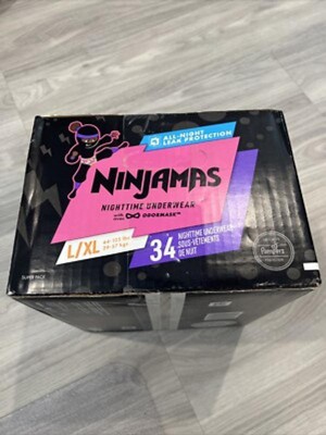 Introducing Ninjamas Nighttime Underwear, the reliable solution for nighttime accidents and a good night's sleep! With our NEW AND IMPROVED design, our nighttime pull ups help you say goodbye to wet sheets from overnight leaks and hello to good mornings. Designed for both boys and girls, our overnight underwear combines comfort and protection so your child can wake up dry every morning. With up-to 100% leak protection for 12 hours, you and your child can finally enjoy the peaceful nights you deserve.Created with patented Pampers LockAway Channels, our innovative nighttime pull-ups absorb liquids 3x faster* than the leading brand, guaranteeing powerful all-night leak protection. The 360 degrees FormFit Waistband ensures a snug, underwear-like fit that accommodates children of all sizes, making it easy for them to pull up and down independently. Plus, our OdorMask Technology discreetly neutralizes unpleasant smells from overnight accidents, so your child can wake up fresh and ready for the day.As a proud partner on your big kid's journey towards independence, we prioritize your child's health and comfort. Our disposable bedwetting underwear is free from harsh chemicals, including parabens and latex***, making them safe for even the most sensitive skin. We are committed to your satisfaction, offering a Money Back Guarantee**** to ensure you are completely happy with your purchase.Available in sizes S/M (38-70 lbs) and L (64-95+ lbs), Ninjamas cater to kids of all sizes and age and are the perfect choice for parents seeking reliable and effective bedwetting underwear for kids. Make bedtime better with Ninjamas Nighttime Underwear by Pampers, the #1 Pediatrician recommended brand!(*vs. Previous Product) (**Based on size S/M and L vs. leading nighttime underwear. 280ml across 2 loadings) (***No natural rubber) (****Visit ninjamas.co/en-us/money-back-guarantee for full terms)