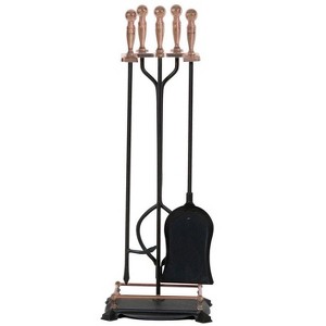 Combine contemporary and antique elements on your hearth using the panacea fireplace toolset. This ornate and functional set keeps your fire tools within easy reach and its black body lends a classic feel to the unit. An antique brass finish on the top of the stand and tool handles completes the color scheme, creating a timeless effect.