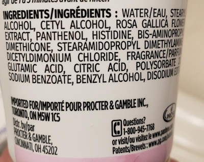 ingredients/ingredients : water/eau, stearyl alcohol, cetyl alcohol, stearamidopropyl dimethylamine, bis-aminopropyl dimethicone, fragrance/parfum, benzyl alcohol, dicetyldimonium chloride, glutamic acid, peg-2m, disodium edta, citric acid, panthenol, panthenyl ethyl ether, histidine, rosa gallica flower extract, methylchloroisothiazolinone, methylisothiazolinone.' '
