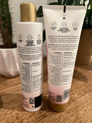 Our gentle formula uses 0% sulfates, silicones, parabens, mineral oil, and dyes. This frizz-taming formula helps to gently restore silky softness to stubborn locks and seal in moisture. Enjoy the scent of fresh botanicals inspired by a bouquet of soft dewy roses!