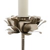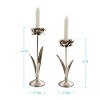 Embrace the beauty of nature inside the warmth of your home with this set of 2 nature inspired candlestick stands. Featuring beautiful blooms in a shiny, metallic silver finish, these decorative candle displays bring a relaxing candlelit aesthetic to the surrounding area for everyday and formal use. Made of sturdy metal, the flower candlestick holders provide a unique lighting element to utilize as a warm, wedding centerpiece arrangement, tabletop accent, or mantel display.