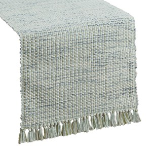 Beautifully accentuate your tabletop decorations with this textured table runner. Its soft hues of blue and green are accented by tassel fringe ends that make it ideal for a variety of occasions. Dress this versatile woven table runner up or down to match any occasion or seasonal decorating perfectly. This decorative table mat will undoubtedly be the perfect timeless dinner accessory for a variety of interior styles including cottage chic, coastal, boho, spring decor, and more. Simply place the braided dinner mat down the middle of a table setting for a quick and aesthetic centerpiece display.