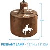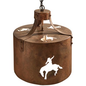 Full of rustic character and dynamic decorative cutouts! The copper metal shade on this Western hanging ceiling light features silhouette cowboy and horse cutouts that creates a charming shine-through effect paired with a cord for a versatile and stylish lighting accent to softly illuminate a kitchen island, entryway, dining room, or bedroom space. With 3 feet of adjustable chain combined by 7 feet of cording and a coordinating ceiling plate, this hanging light pendant can be easily hard wired to any desired ceiling. Pair this country farmhouse ceiling light with a 60 Watt bulb for full effect, not included.