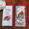 Add a pop of color to your Christmas kitchen decor with this magical holiday dishtowel set of 2. Features a printed winter design of a classic red cardinal bird surrounded by festive pinecones and berries with the wording, 'Cardinals appear when angels are near' paired with a plain red hand towel. This Christmas kitchen set is made of premium 100% cotton material that will provide a durable and moisture absorbent tool for the holiday season.