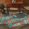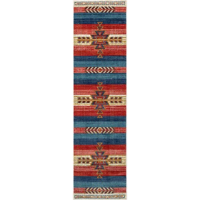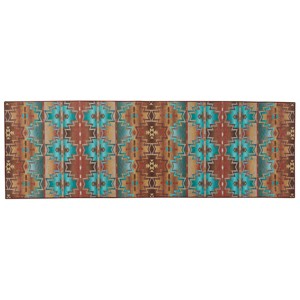 Transform your interior space into a ranch inspired style with this wonderful western rug runner. A splash of vibrant teal highlights against the burnt orange and natural earthy tones that beautifully complements the intricate geometric Southwestern design, bringing the depths of the nature into the comfort of your own home. Made from 100% poly material with a non-skid back and convenient machine washable characteristic, allowing for long-lasting comfortability and a durable flooring accent perfect to enhance any living space that provides a welcoming path for guests and loved ones throughout the year.