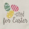 Humorous with a touch of holiday charm, this funny pun dishtowel set of two is the perfect addition to any Easter kitchen decorations. These decorative tea towels feature witty wording, 'Egg-cited for Easter,' embroidered in gray thread. The stitched saying is beautifully accented by a set of patterned Easter eggs and a scalloped mint colored bottom trim. The pastel colorway and adorable design offer the perfect decorative accent to amplify an Easter gift basket or any spring farmhouse kitchen decorations. Crafted from long-lasting cotton material, these shabby chic dish towels provide a functional and stylish tool to utilize during everyday kitchen tasks. Simple to display on an oven handle or on a wall hook using the sewn-in tab.