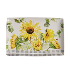 Bring a touch of sun and nature indoors with this decorative platter featuring the colorful blooms of sunflowers. Crafted from durable stoneware, with a vivid printed decal, and protected by a glaze, to last for many years to come. This serving dish will enhance most any kitchen decor such as country, farmhouse, boho, modern and more! Makes an excellent gift for wedding, anniversary, and especially housewarming!