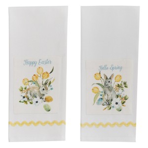 Invite the spring vibes with this Easter dishtowel bundle that will brighten any kitchen space in colorful hues and an adorable, printed design. Includes two decorative dishtowels that will add warmth into your seasonal home decor provided by the yellow, green and blue hues in the nature inspired patches. Both patches feature a printed bunny rabbit design surrounded by various tulips and other gorgeous flowers, paired by an elegant font that spells out 'Happy Easter' and 'Hello Spring.' Crafted out of 100% premium cotton for the perfect Easter gift idea or a lovely spring kitchen decor addition.