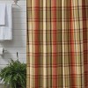 Breathe new life into your bathroom with this beautiful shower curtain. The versatile blend of green, browns, cream and red work perfectly together to create a pretty plaid that is full of country charm. The shower curtain features twelve sewn in holes for hanging and ample width and length, so when used on a standard bath, the curtain falls into attractive folds that adds warmth and comfort to the setting.