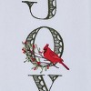 Capture the classic combination of holiday hues and seasonal staples! This decorative embroidered dish towel set of two spells out 'Joy' in an elegant font, intricately stitched in festive green thread with a red cardinal bird perched on a holly berry branch against a solid white fabric. These winter dish towels embrace the whimsy appeal of the outdoors for the perfect seasonal nature-inspired accessories to include in Christmas kitchen decorations or a thoughtful holiday stocking gift. Crafted from soft cotton material, these intricately stitched kitchen towels provide a functional and stylish tool to utilize during everyday tasks.