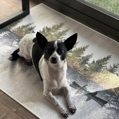 Capture the still, serene atmosphere of lake life with this rustic printed rug. Features a foggy forest landscape of a scenic reflective lake view with two fishermen in a canoe lined by towering pine trees. Made from 100% poly material with a non-skid back and convenient machine washable characteristic, allowing for long-lasting comfortability and a durable flooring accent perfect to enhance any living space that provides a welcoming path for guests and loved ones throughout the year. Adds interest and dimension to any farmhouse, country, lodge, cabin, primitive room decor, and more.