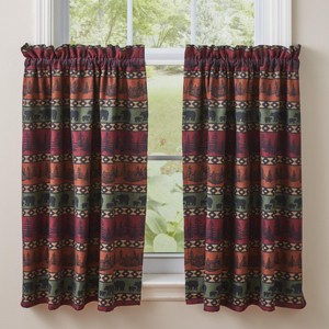 Create a cozy, mountain inspired retreat with these rustic tier curtains that will amplify any room space. Features a wilderness pattern with bears, trees, and a lodge cabin in a rustic inspired woven jacquard design. This window treatment will complete your everyday or winter home decor with its versatile pattern and vibrant hues.