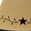 Star Vine is a traditional country pattern with a tan background and a black border on the top and bottom. This rustic lampshade features an embroidered star and berry vine detail encircling the bottom that will add the perfect touch to any traditional or country style home. Crafted using 100% premium cotton fabric over an opaque backing, hand-trimmed, and sewn.
