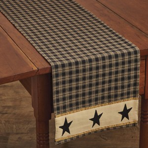This beautiful pattern features a black and tan woven plaid that is eye catching and pretty, with a beautiful black star border. A perfect covering for everyday use or formal setting. This table runner will add visual appeal to decor while protecting surfaces from daily wear and tear and can be used on an entryway, dining, or kitchen table for a touch of country charm.