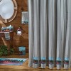 Full of rustic charm, this farmhouse shower curtain includes a versatile gray stripe pattern with decorative accent patches that provide a great addition to any primitive bathroom decor. Each patch has a detailed graphic by the talented artist Timothy Wilson Hoey, featuring a delightful trio of woodland creatures including a bear, moose, and beaver that peacefully paddles through a lake setting on a beautiful red canoe for a unique outdoorsy addition to your lodge cabin bathroom decor. The thick cotton fabric is designed to be used for years to come for a reusable bathtub addition, can be effortlessly coordinated with a wide variety of patterns and styles to create a unique atmosphere for guests and loved ones.