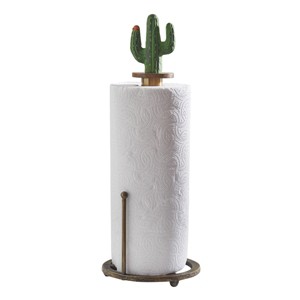 Bringing a touch of rustic charm, this Southwestern inspired paper towel holder stand gleams in a golden bronze finish with an adorable cactus topper. Perfect to either keep near a kitchen space or dining room setting to efficiently store items for dinner parties, everyday meals, and holiday gatherings. The decorative topper and circular metal base offers convenience as a portable storage accessory. Not only adds visual appeal, but also offers a practical aspect by preventing the paper towel roll from unraveling with the arm that provides a spot to tear a sheet off with ease. Trouble-free design that allows for easy removal to add a new paper towel roll by simply sliding it through the vertical pole from the top.