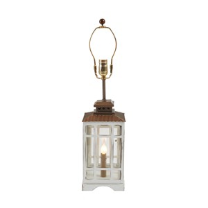 Amplify a country farmhouse interior, beach house or shabby chic home with a versatile lighting accent that won't go out of style. Inspired by a lantern, this table lamp base has a copper top and metal frame construction in a rustic white finish. The base features glass panels and a functioning door that allows for easy access to change the lower bulb. Pair this table lighting accent with a lovely lampshade, not included, along with a 60 Watt and 7 Watt bulb, both not included.