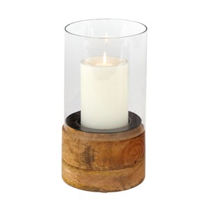 Illuminate any living space with this rustic pillar candle holder! Features a wooden base with a removable glass hurricane cover that provides a natural bohemian touch perfect to use as a lovely dining table centerpiece or decorative mantel accent. Instantly amplifies your favorite pillar candle to become a lovely addition to your everyday home decor or great gift idea for a housewarming, wedding, birthday or any special occasion.