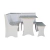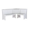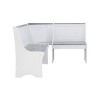 Open your family gathering space to new possibilities with this versatile corner nook. Whether you’re looking to reconfigure your kitchen or add dimensionality to your dining room, these 3 pieces is up to the task. Made of solid pine for long term strength and stability, the frames are covered in a lustrous white paint, while the top panels are finished in a rustic gray wash. The set seats up to 5 and features hidden storage compartments under the corner benches, allowing you to tidy up without overcrowding.