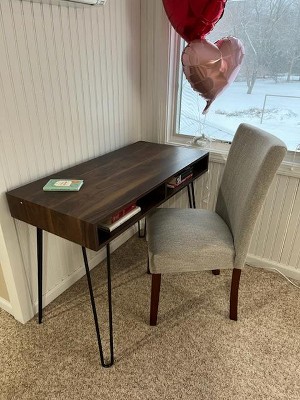 We recently moved across the country and got rid of all of our furniture. When we found out that everyone wanted to come to our home for Thanksgiving, we bought a beautiful large antique dining table at a Thrift store and wanted 8 new chairs to go with it. These chairs were perfect. Great neutral fabric color (tweed) and medium brown wood legs that go with everything, comfortable, and easy to assemble. We caught them on sale which made them half the price of comparable chairs we saw elsewhere.