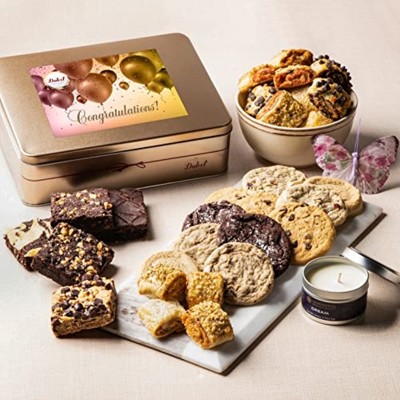 - CONGRATULATIONS FOOD GIFT BASKETS - CONGRATULATING YOUR LOVED ONES HAS NEVER BEEN EASIER: Congratulate your friends, family members or coworkers on any special day with this beautiful gift basket filled with mouthwatering sweet treats! Perfect for congratulating any of your dear ones on an Engagement, Wedding, Anniversary, a New Baby or even on a New Home, Promotions, Graduations, Retirements or any other accomplishment. After all, there is always room for delicious tin box of chewy, soft, gooey chocolaty baked creations!