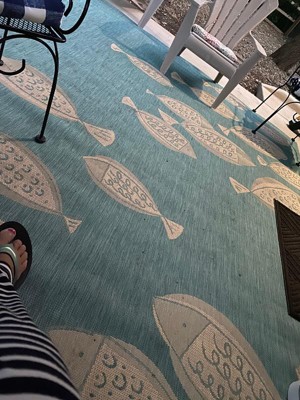 I love the rug. Bought for my fishing pier, so fits the theme perfectly. Unfortunately, the size advertised was incorrect. The actual size is 10 ft x 8 ft 1 1/4 inches. Doesn't sound off by much (what's 4.25 inches) unless you have a post that is 7 ft 11 inches in the spot selected for the rug. I will keep the rug and have my neighbor cut the rug to fit around the post. If you don't have a post to deal with, the blue is a soft turquoise. No damage upon receipt and arrived promptly. I would have rated it a 5 if it were the advertised size.