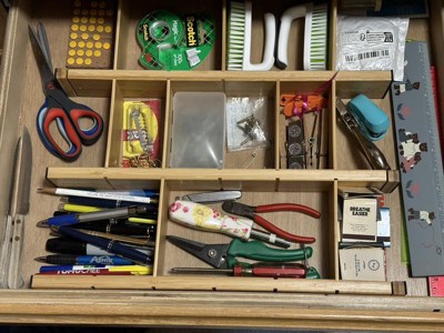 Can’t believe how my totally disorganized junk drawer looks now! Easy/Quick Assembly! Unnecessary items thrown away! There are adhesive labels I chose not to use. Thank you Target for sending me this SpaceAid Bamboo Drawer Dividers System! Will be ordering at least 2 more!
