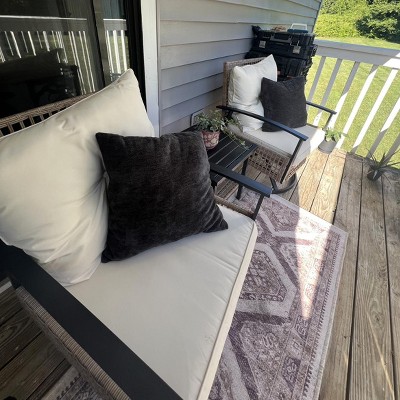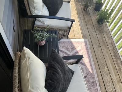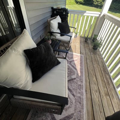 So cute! Perfect for our little patio outside our apt. The cushions are supportive and I love the ability to turn and rock in the chairs! It was such a great price that I had to get it! We just received it a week ago so I can’t say on long term hold up but my husband and I are not small or short people - 6’4 and 5’10 and it’s perfect for us!