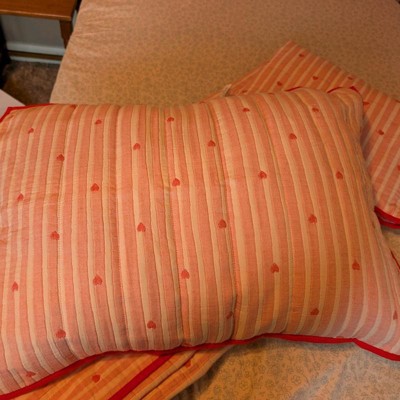 [This review was collected as part of a promotion.] I ordered this quilt for my daughter and I ordered a twin size. It fits perfectly on her bed. The quilt is comfy and has the perfect amount of filler the make it a little poofy but it's not heavy like some quilts can be. The quality of the blanket and pillow sham is noticably made well and I like the little detail of the red boarder on both the sham and quilt.