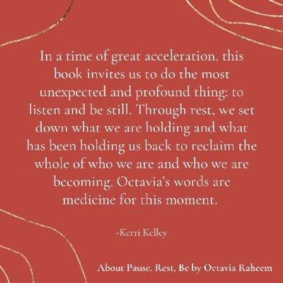 "For those of us who carry the weight of the world on our shoulder and in our hearts, Octavia Raheem's words offer a call to rest that is not about denial or selfishness, but instead is about the rest that is required if we are to live fully and embrace the complexity of our shared humanity. Pause, Rest, Be is an antidote to a culture of speed and burnout (often rooted in trauma), and a call to remember who we really are and can be."