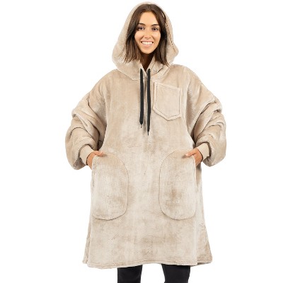 PAVILIA Faux Shearling Wearable Blanket Hoodie, Cozy Oversized Hooded Sweatshirt Adults, Warm Fleece Big Pocket (Taupe, Adult Long)