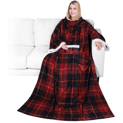 PAVILIA Fleece Wearable Blanket with Sleeves, Warm Cozy Snuggy Soft Functional Lightweight Sleeved Throw Adults Men Women, Plaid Red/Fleece