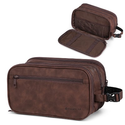 - MENS TOILETRY BAG: This functional PU leather toiletry travel bag has a large compartment and side pockets with additional pockets to hold all your toiletry, shaving, and grooming accessories. Equipped with elastic bands and additional mesh pockets to keep your hygiene items secured while traveling, weekend trip at hotel, or at home, this cosmetic make up case will help you stay organized.