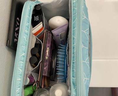 This toiletry case has so many nooks and crannies to put things. The numerous pockets make organization a breeze. It’s a little wider than I was expecting, but it still fits nicely on the side of the sink. Love the color and pattern