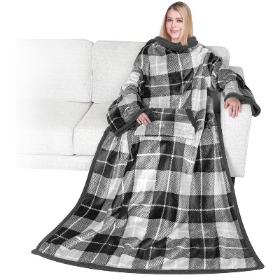 PAVILIA Wearable Blanket with Sleeves and Foot Pockets, Fleece Warm Snuggy Pocket Sleeved Throw for Women Men Adults, Plaid Charcoal/Faux Shearling