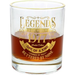 Celebrate a loved one’s milestone with this 8 oz old-fashioned whiskey glass, perfect for those born in 1977. Measuring 3.75" tall and 3" in diameter, this rocks glass combines style and functionality, ideal for savoring whiskey, bourbon, or any favorite cocktail. The glass features a gold electroplated rim and displays a gold sentiment decal: “Legends Were Born In 1977, Genuine Quality, Limited Edition, One Of A Kind, Admired By Many, Bettered By None,” highlighted with banners and stars. Packaged in an open-faced black gift-ready box with a To:/From: section on the back, it’s a thoughtful gift for any birthday or special occasion. This unique glassware will brighten their day and serve as a cherished keepsake for celebrating the past year and the years ahead. Just add their favorite drink and let the party begin! Hand wash only with light soap and the soft side of a sponge; avoid soaking in water for extended periods and dry immediately to preserve quality. Explore our extensive selection of rocks glasses with birth year designs ranging from 1949 to 1993. Be sure to check out our storefront for more personalized gifts and unique keepsakes to celebrate any special occasion!