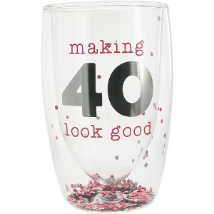 14 oz double-walled drinkware is made from borosilicate glass. Between the walls, there is freely moving confetti. The front of the glass has a pink and metallic silver sentiment, "Making 40 Look Good." The round confetti is pink and iridescent. Soft hand wash only. Do not leave soaking in water for extended periods of time. Dry immediately. It is packaged in a die-cut box. Celebrate a loved one's birthday; this unique glassware will brighten their day. Throw a party commemorating the past year and the years ahead with a cup they can use in the year ahead. Add small hair accessories, sweet chocolate treats, pens, and other desk essentials to display this unique glass for the year. An added bottle of Merlot, Riesling, Chardonnay, Gewürztraminer, Sauvignon Blanc, Malbec, Zinfandel, Pinot Grigio, and red or white wine lovers brings this item to its prime.