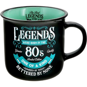 This 13 oz double-sided design mug features a comfortable handle, smooth straight walls, an easy-to-sip curved lip, an overall glossy finish, and bold pops of color on the interior and exterior of the drinkware. "Legends Were Born In The 80s, Genuine Quality, Limited Edition, One Of A Kind, Admired By Many, Bettered By None" decal is in full caps, black and white, with multi-directional lines of words intertwined with seafoam green swirls and banners which stand out on the stark black exterior. The seafoam green interior has a black "Legends Of This World" logo on the interior only when the handle is facing to the right side only. Dishwasher and microwave safe. Prop 65 certified. Package in a protective die-cut box.