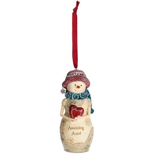 Hand-painted snowman figurine, packaged securely in a printed box, is made from polyresin and features a tied ribbon for hanging. "Amazing Aunt" text is debossed and hand painted onto the front of the figurine. Dust with a dry cloth. Great for those who wish to decorate their home at Christmastime.